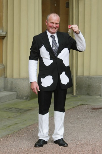 Presenteado com uma medalha da Ordem do Império Britânico, Tony resolveu homenagear sua profissão e suas colegas de trabalho. O terno preto foi acrescido de manchas brancas, como a das vacas holandesas. A gravata também era repleta de desenhos de vaquinhas. Fofíssimo, o leiteiro ficou todo vermelhinho de vergonha quando se encontrou com a rainha Elizabeth.